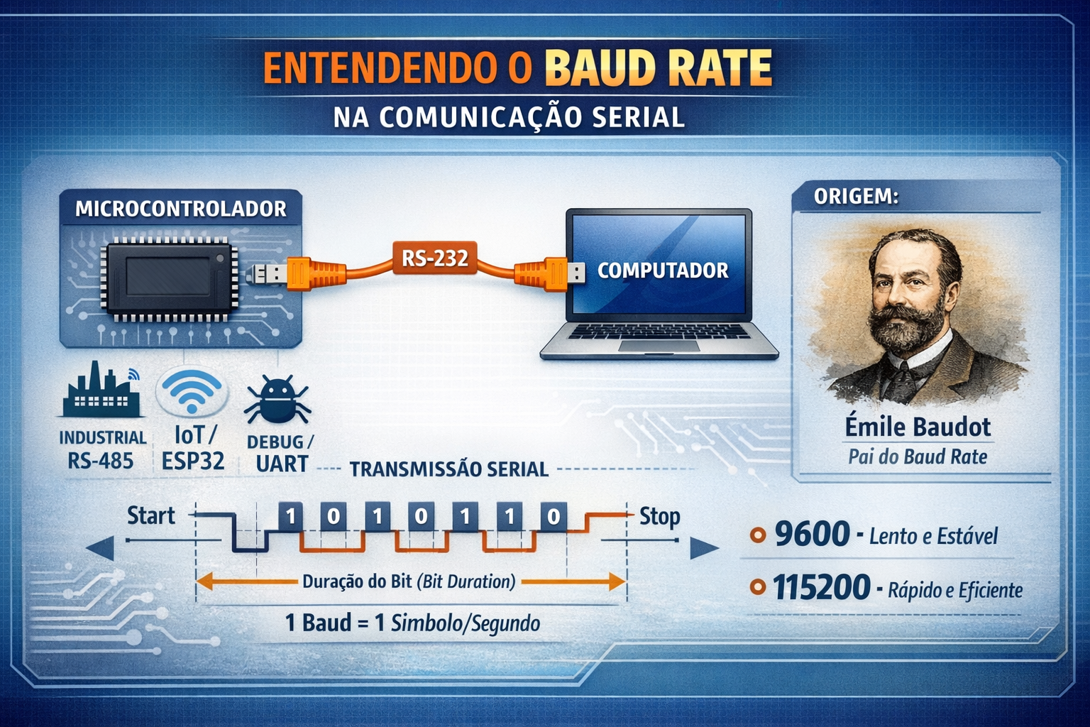 Entenda de forma didática o que é baud rate, sua origem histórica ligada à telegrafia de Émile Baudot e como essa taxa influencia diretamente a comunicação serial em sistemas embarcados
