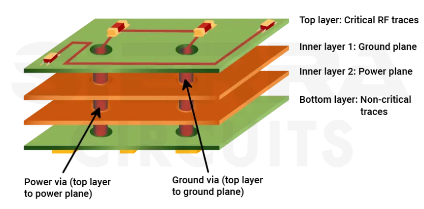 Uso adequado de vias de transição entre camadas.
