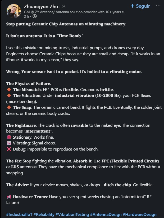 A publicação analisada alerta para um erro recorrente em projetos embarcados industriais: instalar antenas cerâmicas (chip antennas) em equipamentos que sofrem vibração intensa, como caminhões de mineração, bombas industriais e drones. Embora compactas e baratas, essas antenas são fabricadas em material cerâmico, que possui uma característica crítica: é rígido e frágil. Em ambiente estático, funcionam normalmente, mas quando parafusadas em estruturas vibratórias tornam-se um ponto de falha latente.